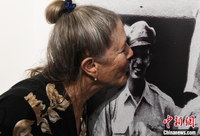 图为飞虎队老兵理查德·奥尔尼之女罗宾·奥尔尼在重庆史迪威博物馆亲吻父亲年轻时的照片。中新网记者 周毅 摄