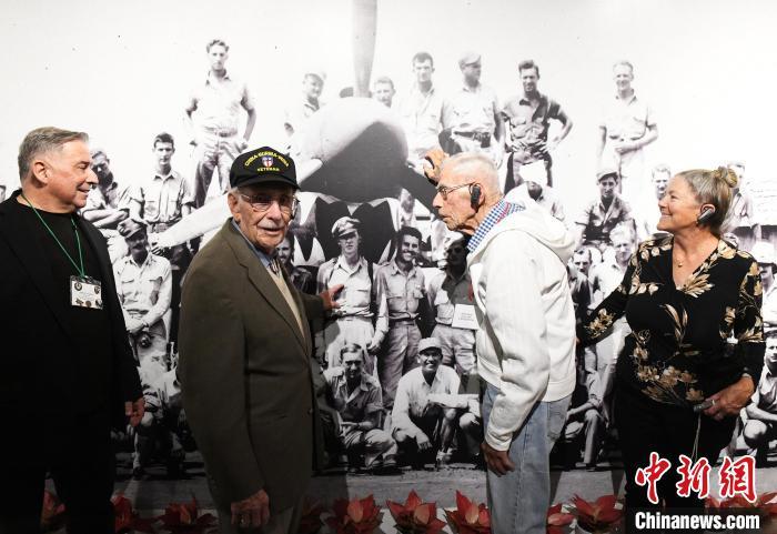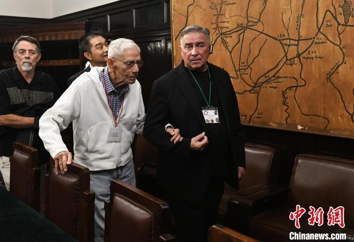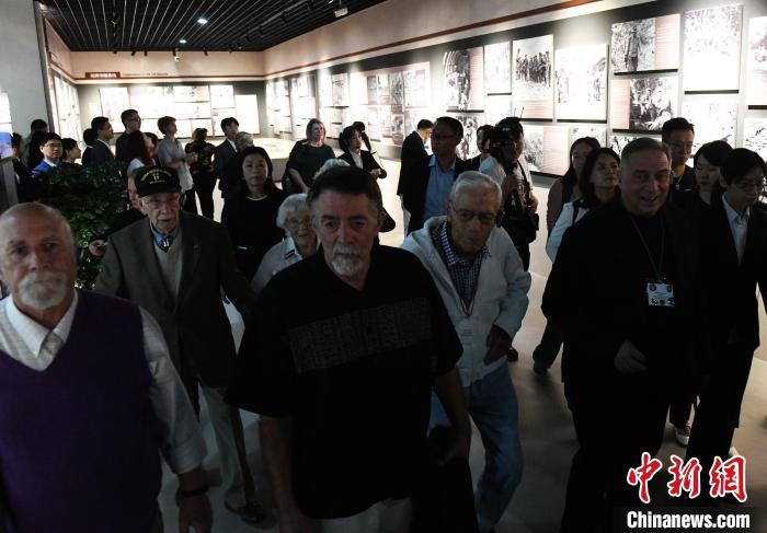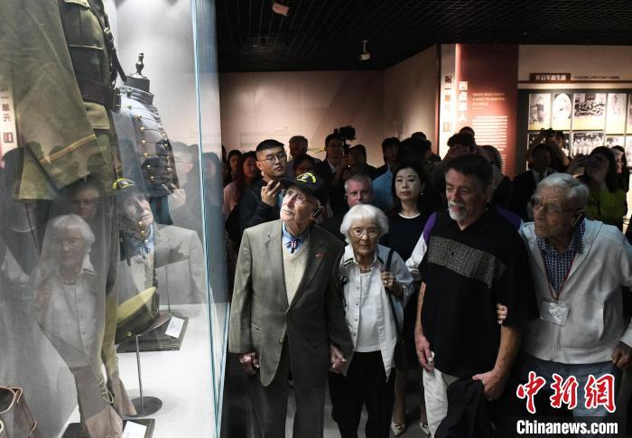 图为现年103岁的哈里·莫耶(前排右一)和98岁的梅尔文·麦克马伦(前排左一)一行在重庆史迪威博物馆参观。中新网记者 周毅 摄