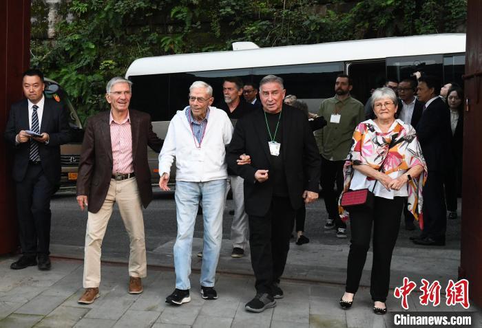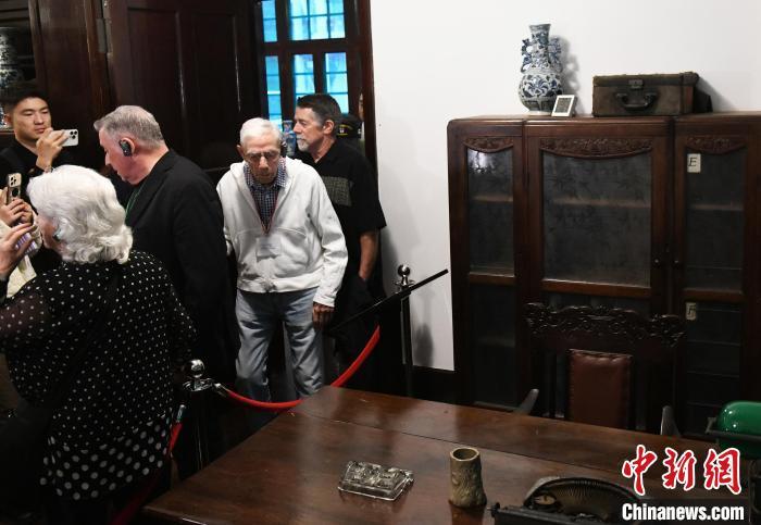 图为现年103岁的哈里·莫耶(左三)和98岁的梅尔文·麦克马伦(左二)一行在重庆史迪威博物馆参观。中新网记者 周毅 摄