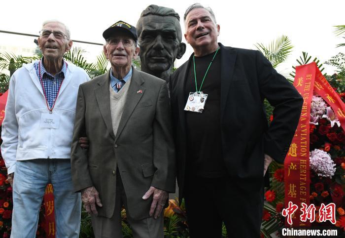 图为现年103岁的哈里·莫耶(左)、98岁的梅尔文·麦克马伦(中)、美中航空遗产基金会主席杰弗里·格林(右)在史迪威将军雕像前合影留念。中新网记者 周毅 摄