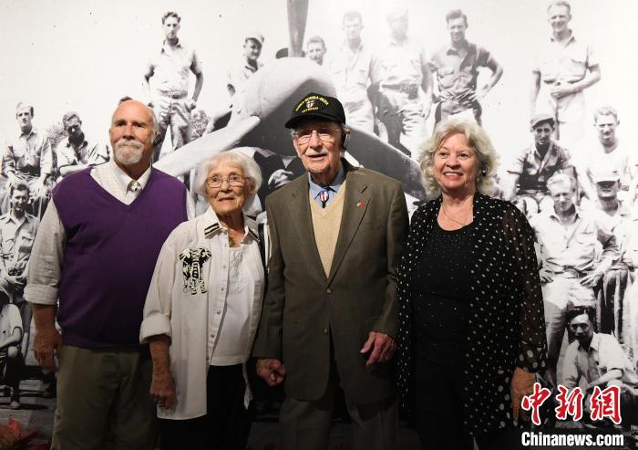 图为98岁的飞虎队老兵梅尔文·麦克马伦(左三)与夫人(左二)、随行人员在重庆史迪威博物馆合影留念。中新网记者 周毅 摄