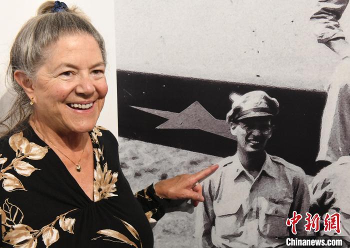 图为飞虎队老兵理查德·奥尔尼之女罗宾·奥尔尼在重庆史迪威博物馆找到了父亲年轻时的照片。中新网记者 周毅 摄