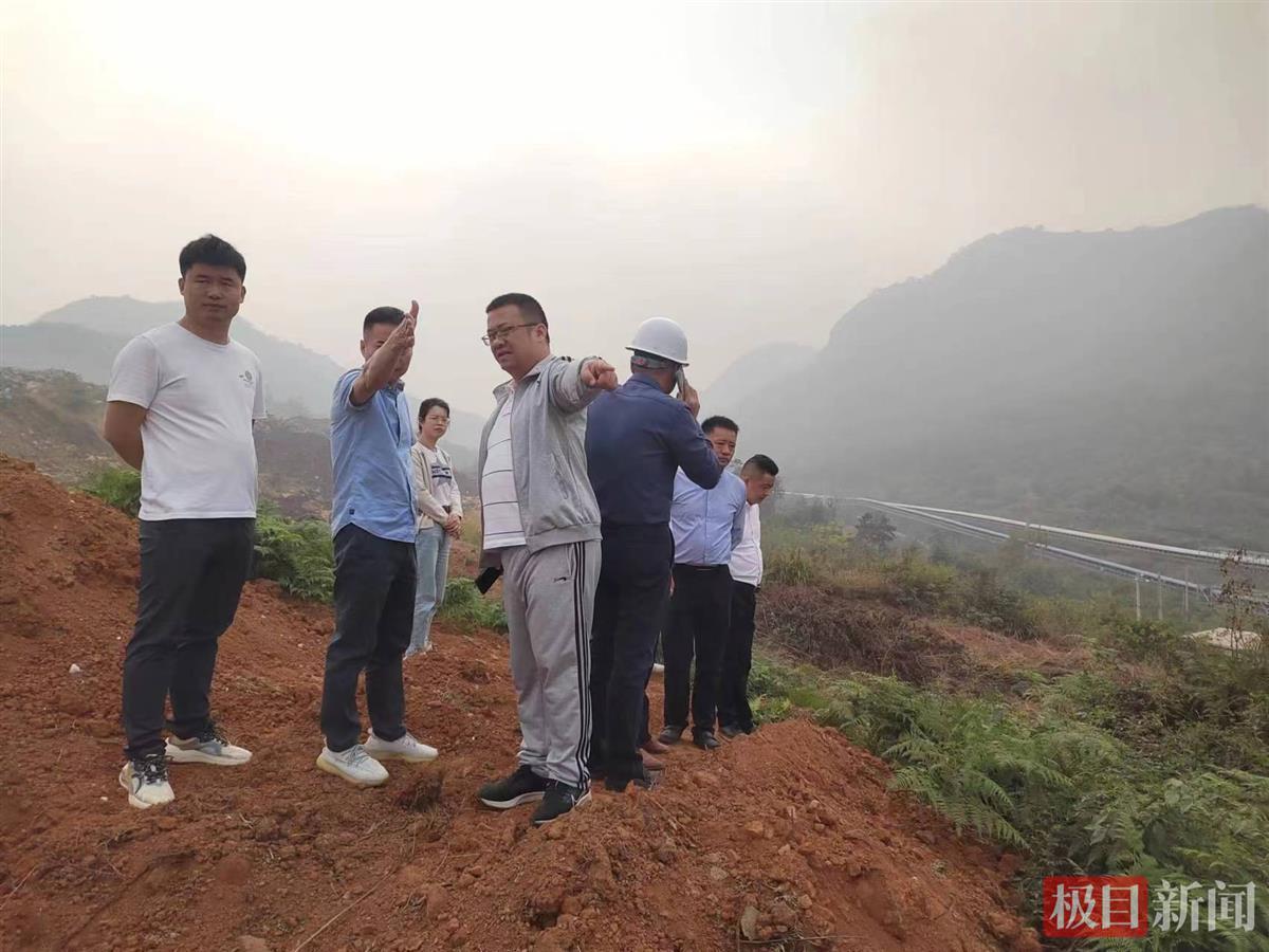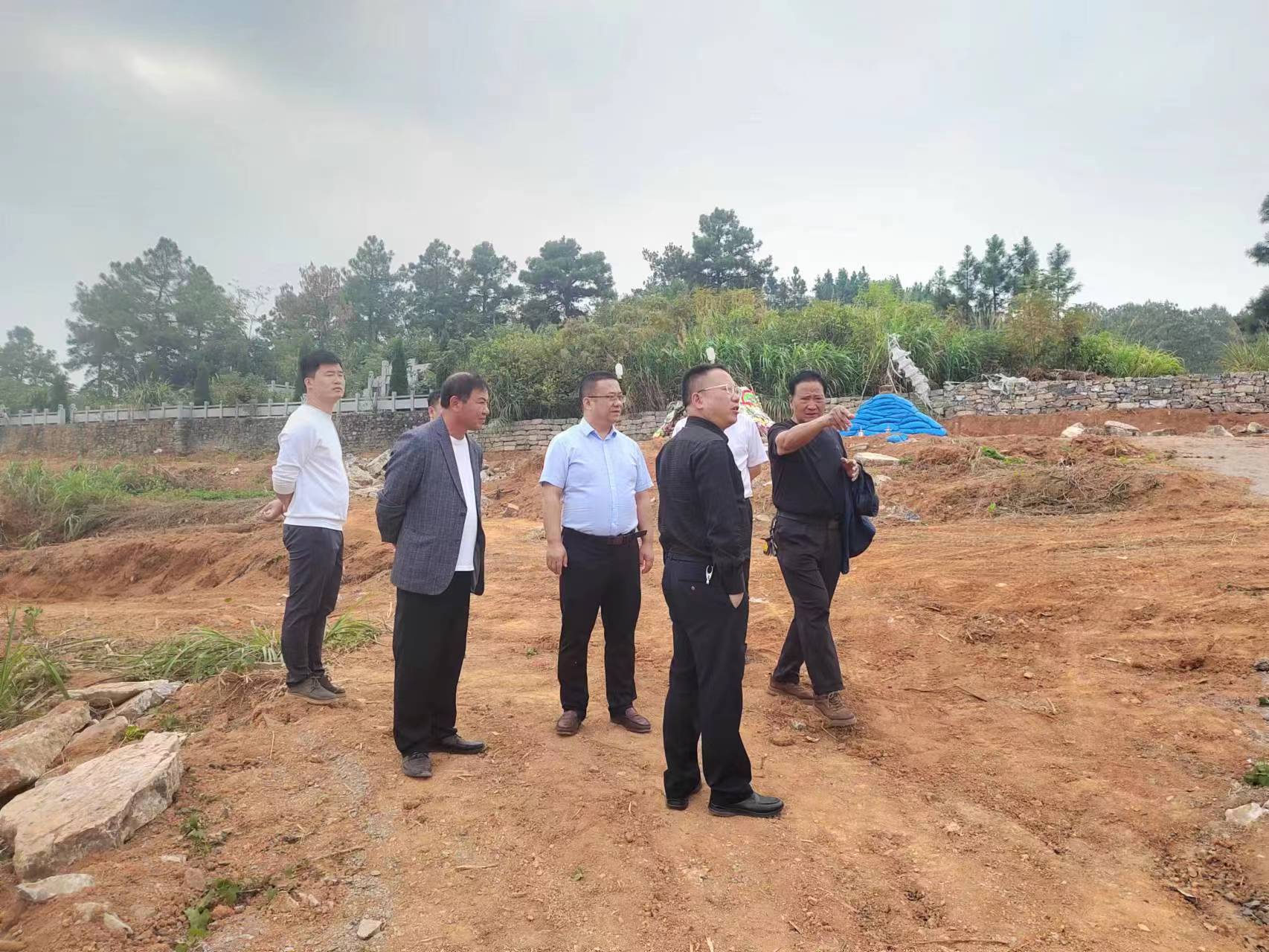 田家镇街道办事处主任梅银国(右一)等在项目工地调研征地迁坟工作