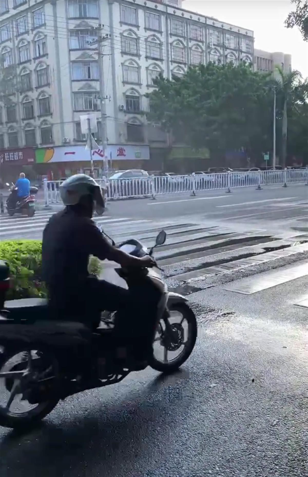 10月31日,一位网友发布视频称,他骑电动自行车途经贵港市港南区江南大道时,被路边路灯杆喷洒的水滴打湿了衣服,感到身体不适。