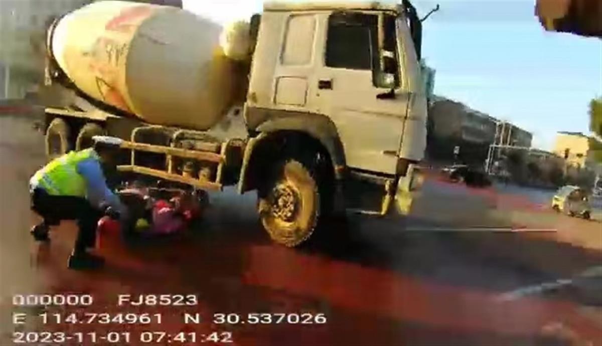 11月1日,湖北省鄂州市华容区楚藩大道与兴华路交会点的十字路口,一辆电动车被卷入搅拌车底,千钧一发之际,路旁交警看到后,10秒钟内飞奔救人。11月2日,救人的鄂州市交警蔡涛告诉极目新闻记者,当时情况紧急,来不及细想,他一边大喊搅拌车一边快步上前救人,好在搅拌车及时刹车,电动车司机并无大碍。