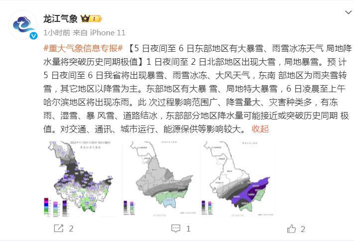 此次过程北方地区雨雪相态复杂,比如黑龙江,有冻雨、湿雪、暴风雪、道路结冰,东部部分地区降水量可能接近或突破历史同期极值。