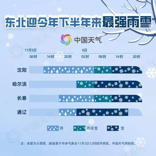 尤其要关注的是,东北将迎今年下半年来最大范围、最强雨雪,哈尔滨、长春、沈阳可能都会出现较强降雪,并出现雨转雪的过程。雨雪进程图↓