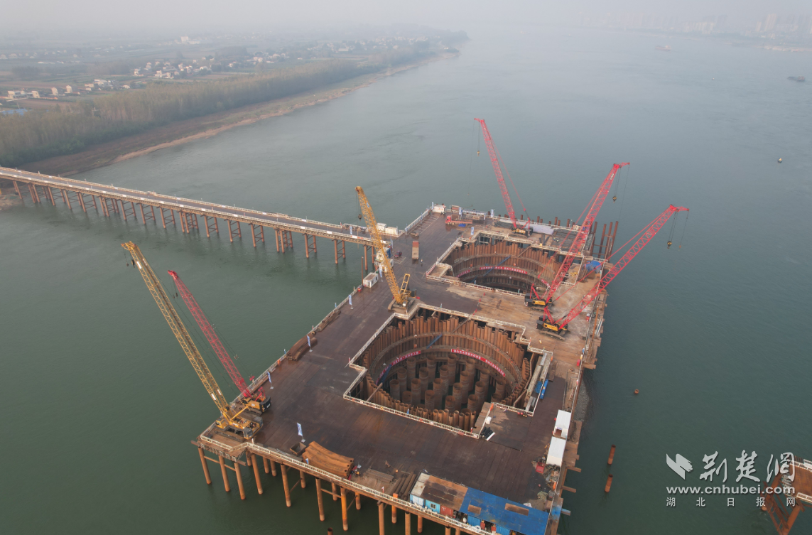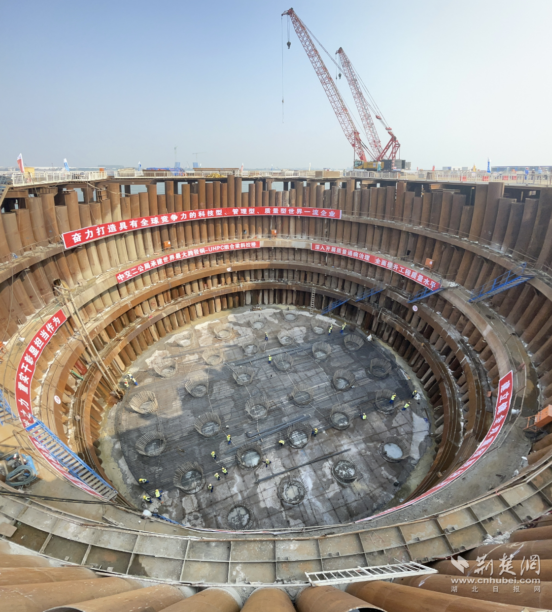 枝江长江大桥是当枝松高速公路的控制性工程之一,主桥全长1549米,是目前世界最大跨径双塔单侧钢-UHPC组合梁斜拉桥,一举将该类型桥梁跨径从700米级提高至890米。大桥南主塔承台采用罕见分离式设计,为对称布置的两个直径39.5米、厚7米,面积约三个篮球场、高逾二层楼的“巨无霸”混凝土圆柱,将深插河床131米的桩基与高257.5米塔柱连接在一起,是大桥重要的受力结构之一。