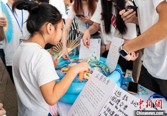 图为以“在蓝色盆中钓鱼”谐音“盂兰盆”、介绍传统“盂兰盛会”的小游戏吸引小朋友体验。 中新网记者 侯宇 摄