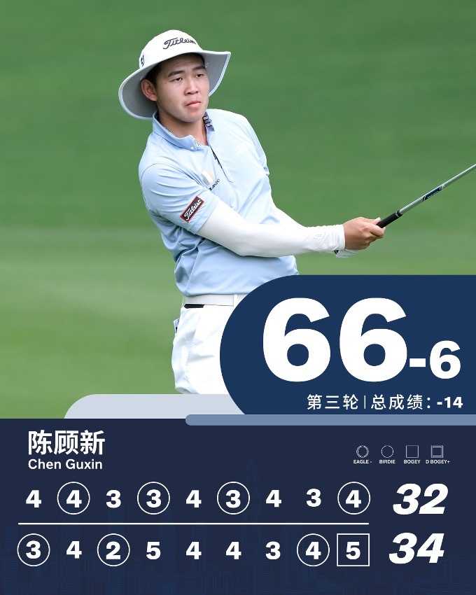 陈顾新全场共抓到7只“小鸟”(低于标准杆1杆),但在18号洞吞下“柏忌”(高于标准杆1杆),交出66杆,总成绩低于标准杆14杆,以3杆的优势领跑。