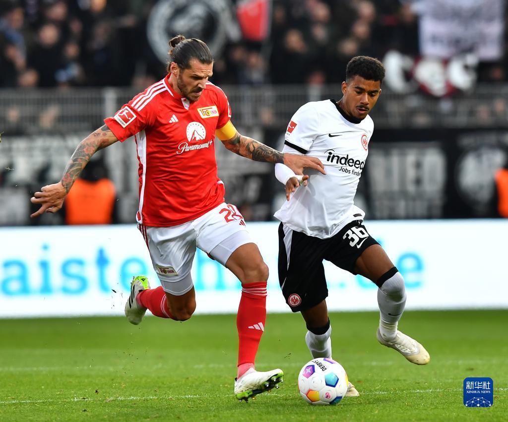 11月4日,柏林联合队球员克诺赫(左)与法兰克福队球员马尔穆什在比赛中拼抢。新华社记者 任鹏飞 摄
