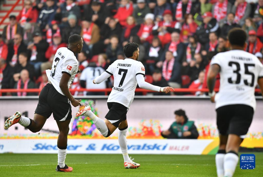 11月4日,法兰克福队球员马尔穆什(左)在比赛中射门得分,打进球队本场第二粒进球。新华社记者 任鹏飞 摄