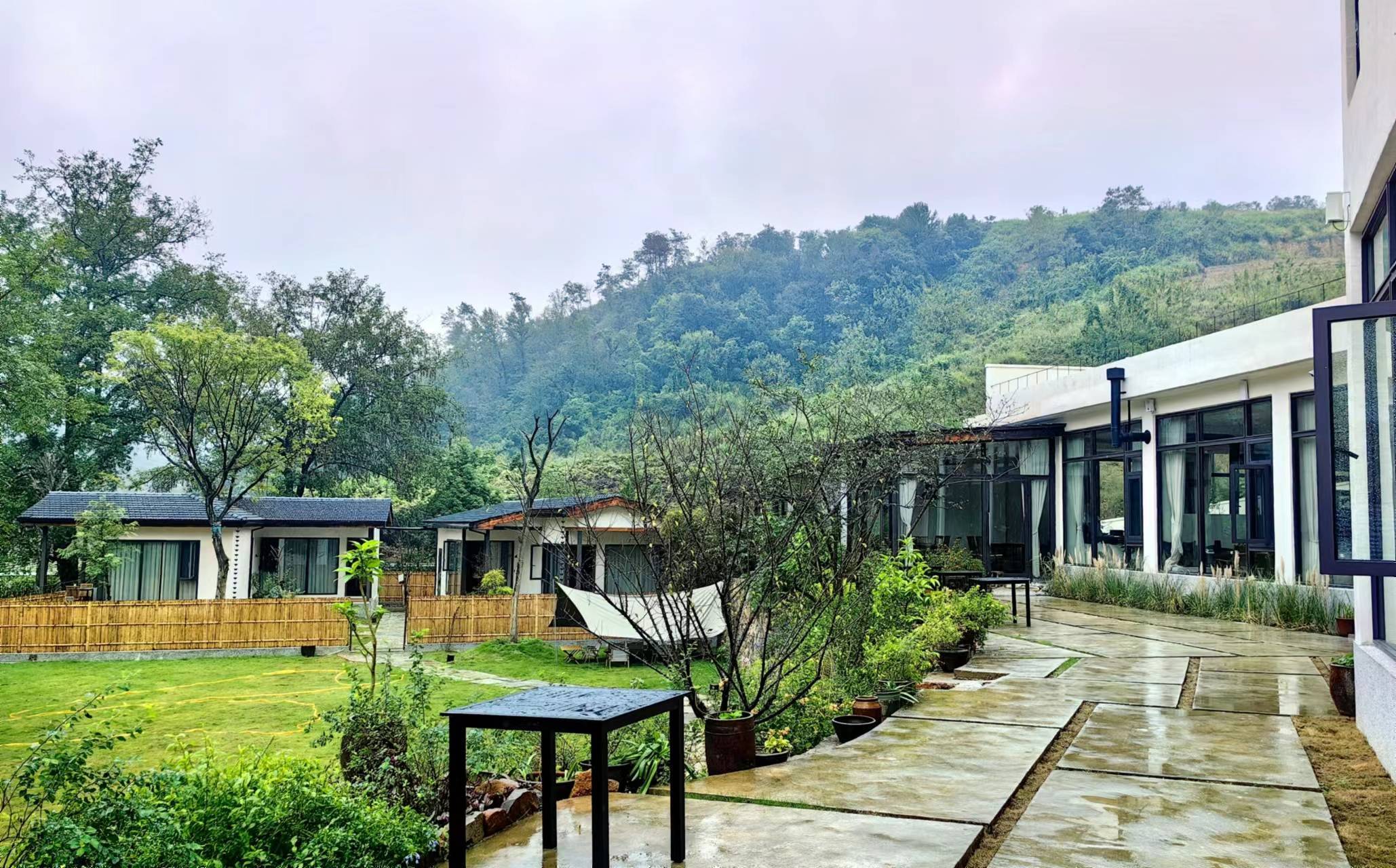咖啡馆大厅摆放着枯死的橡果树,枝丫参差交错,配着泼墨山水画,古韵十足,工作人员从山上采回野花,分插到各个房间内,时光似静止一般。