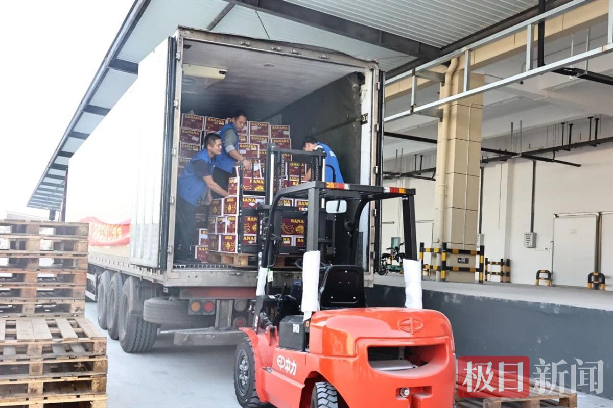 极目新闻记者现场了解到,这批自菲律宾进口的香蕉漂洋过海到达上海港口后,经高速物流运抵孝感首衡城,入库B地块水果交易区。