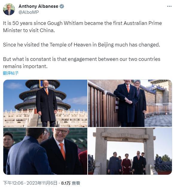阿尔巴尼斯在社交媒体上发布了多张参观天坛的照片,并发文称,“50年前,高夫·惠特拉姆成为首位访华的澳大利亚总理。自从他参观北京的天坛以来,已经发生了很大变化。但不变的是,我们两国之间的接触仍然很重要。”