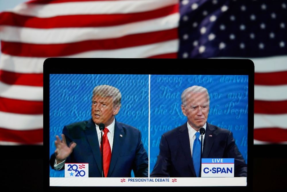 这张2020年10月22日在美国弗吉尼亚州阿灵顿拍摄的视频画面显示,时任美国总统特朗普(左)与时任民主党总统候选人拜登在田纳西州纳什维尔市参加最后一场总统候选人电视辩论。新华社记者刘杰摄