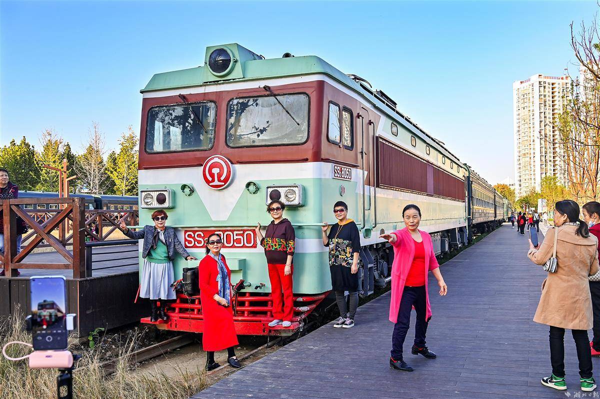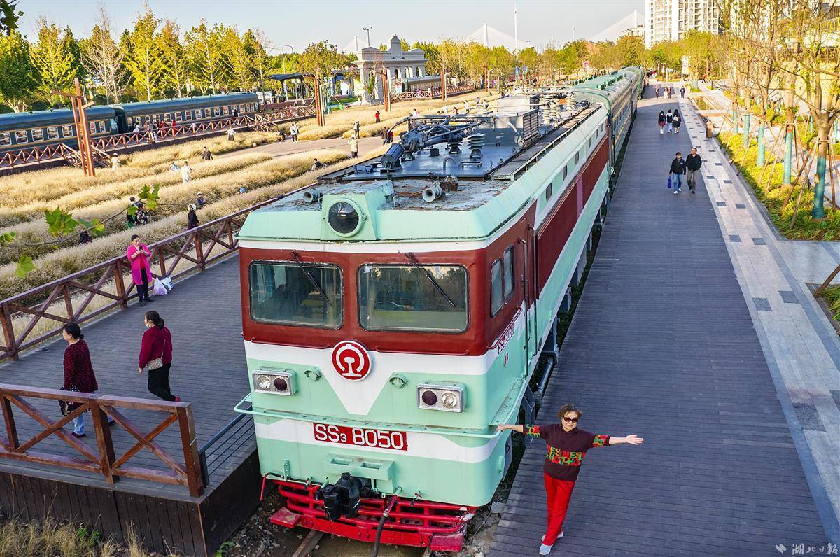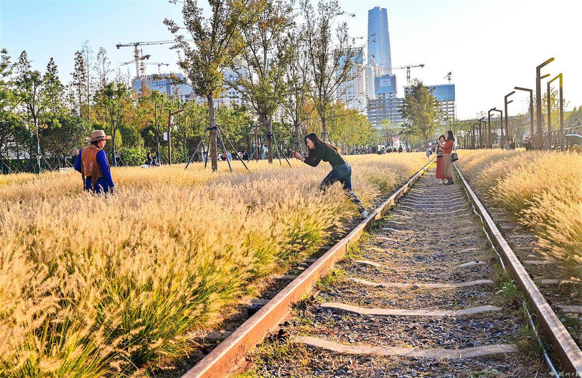 11月3日,许多市民游客在位于武汉长江二桥武昌桥头的四美塘铁路遗址文化公园游玩打卡。11月1日,随着第七届武汉设计双年展在此开幕,这处地标已揭开面纱,全部建成开放。
