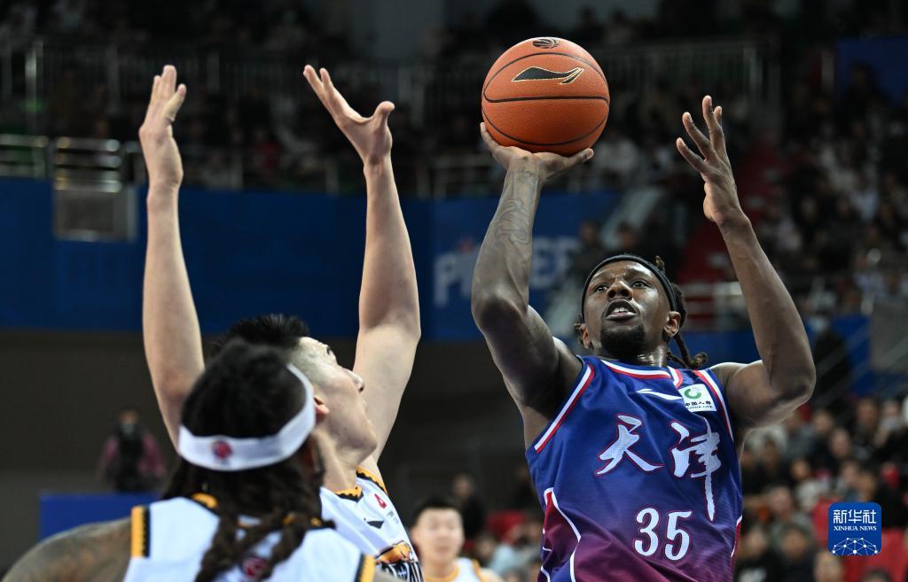 11月6日,天津先行者队球员詹姆斯(中)在比赛中投篮。新华社记者 孙凡越 摄