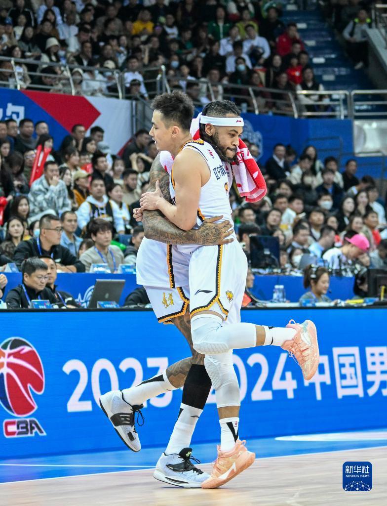 11月6日,辽宁本钢队球员莫兰德(后)与队友赵继伟在比赛间隙庆祝。新华社记者 孙凡越 摄