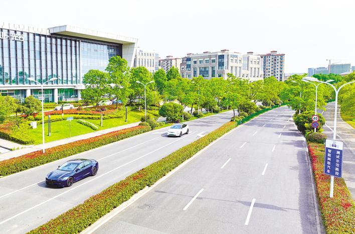 5月9日,武汉东湖高新区花山生态新城,测试车辆在智能网联汽车测试示范路段行驶测试。 (湖北日报全媒记者 魏铼 摄)