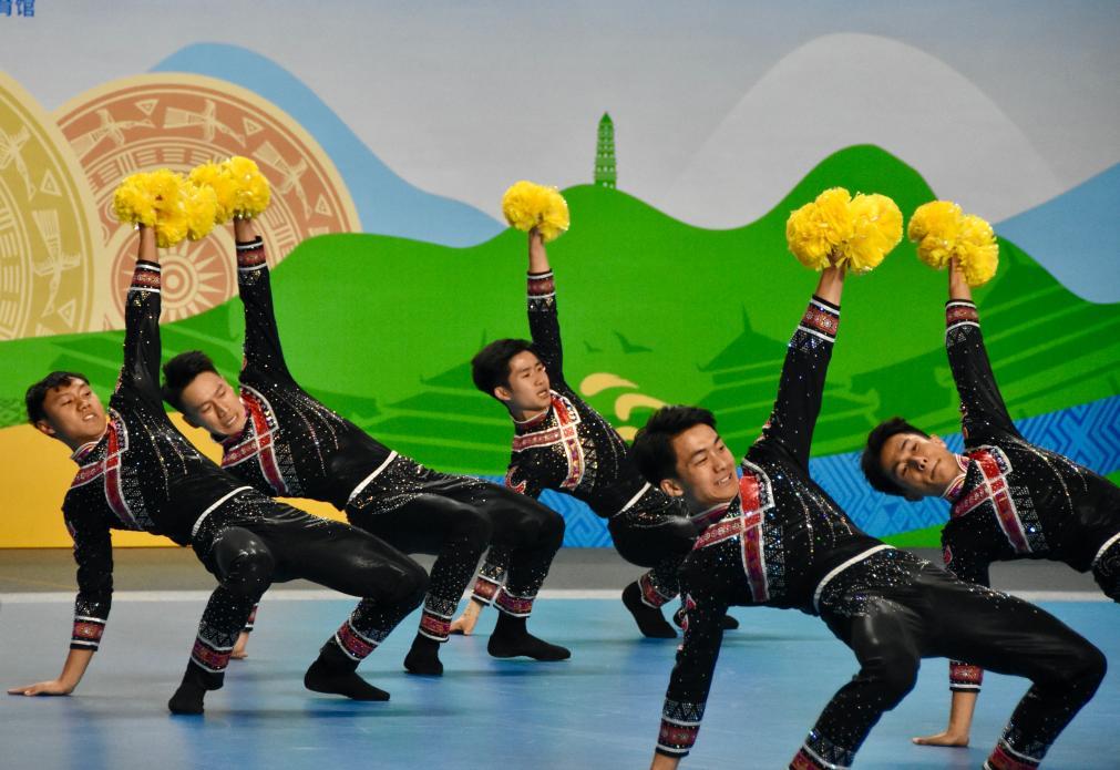 身着民族服饰的云南队运动员在学青会啦啦操比赛中。新华社记者 郑昕 摄