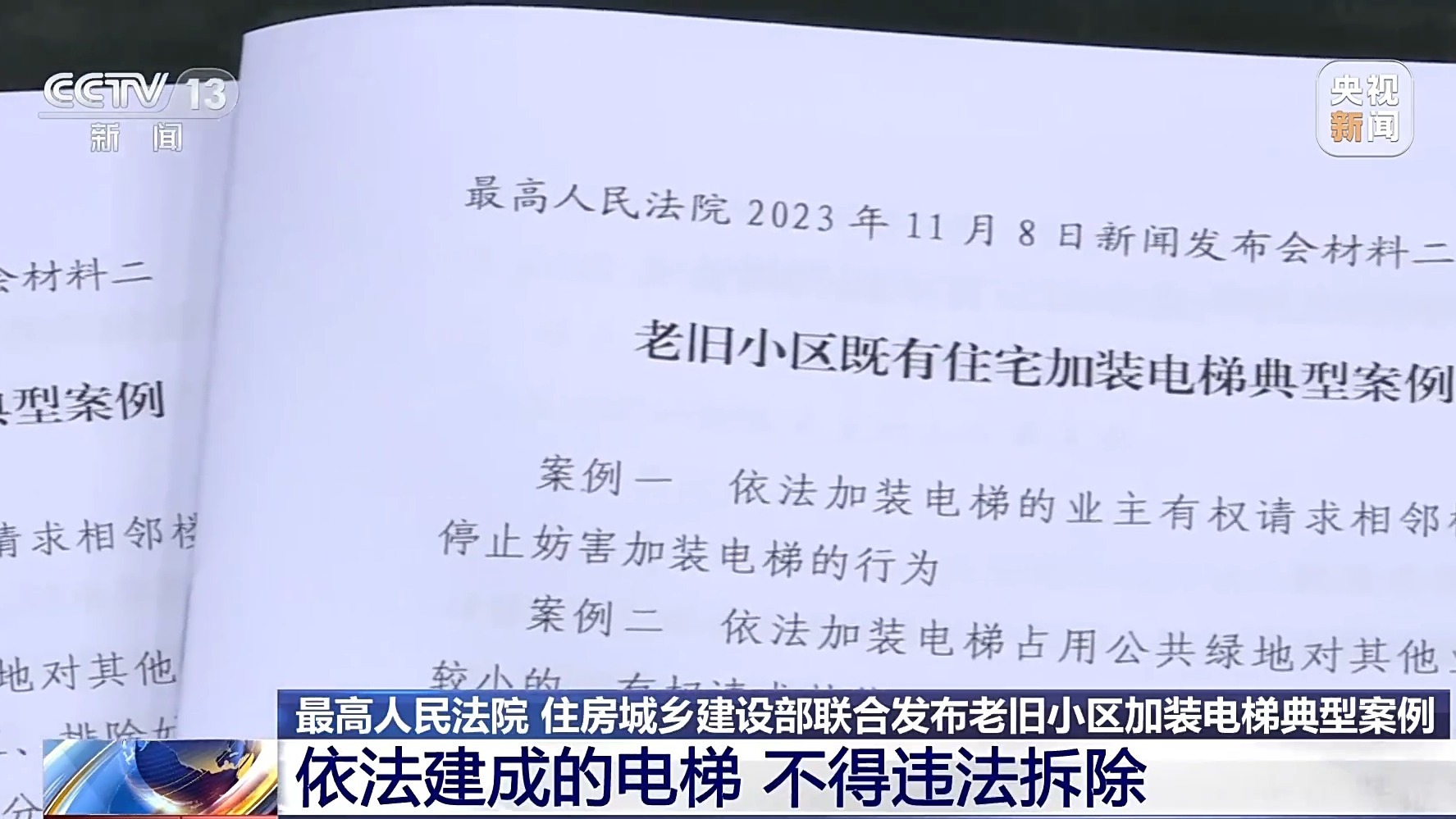 今天(8日),最高人民法院与住房城乡建设部召开新闻发布会,联合发布11个涉及老旧小区加装电梯典型案例,典型案例涉及江苏、四川、北京等多地。最高法相关负责人表示,城市老旧小区加装电梯是推动城市更新、缓解老弱人群出行难的民生工程,也是明显改善人民群众生活质量的善举。但在电梯加装和使用过程中,楼上楼下、左邻右舍因需求和利益不同,容易产生纠纷。此次发布典型案例,为老旧小区加装电梯、妥善化解邻里纠纷提供法治保障。