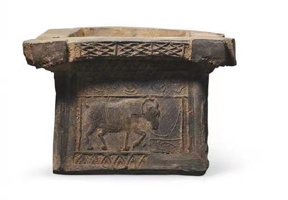 陶器后壁刻有一牛在槽中饮水的图案