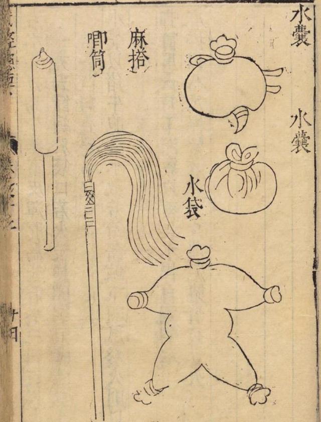 水囊:盛水量小但灵活性强。着火时,可将囊抛入其中。