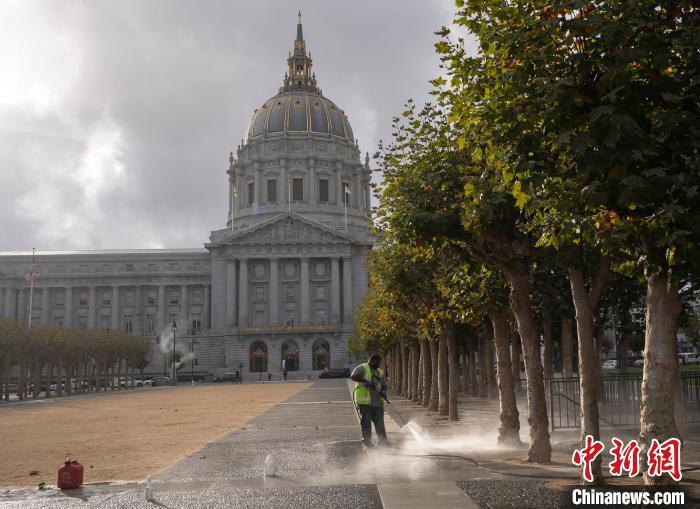 当地时间11月6日,工作人员在旧金山市政厅前的市政中心广场清洁地面。 中新社记者 刘关关 摄