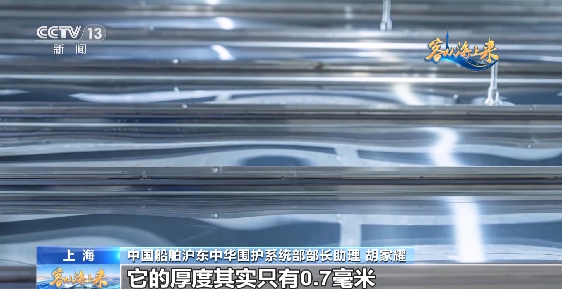 中国船舶沪东中华围护系统部部长助理 胡家耀:它的表面质量和成型要求特别苛刻,像我们刚才看到的这个板,它的厚度其实只有0.7毫米,制造和焊接的技术难度要求都特别高,在沪东中华的这个推动下,殷瓦钢的国产化研究已经取得了巨大进步。