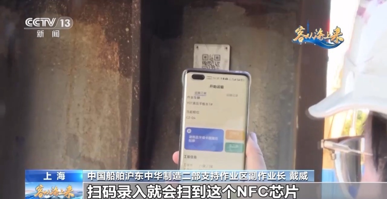 中国船舶沪东中华制造二部支持作业区副作业长 戴威:打开这个软件以后,点开始有一个NFC读卡,扫码录入就会扫到这个NFC芯片,它就会读取这个分段信息,我们点开始运输,这个分段就代表它已经处在一个运输的状态了。