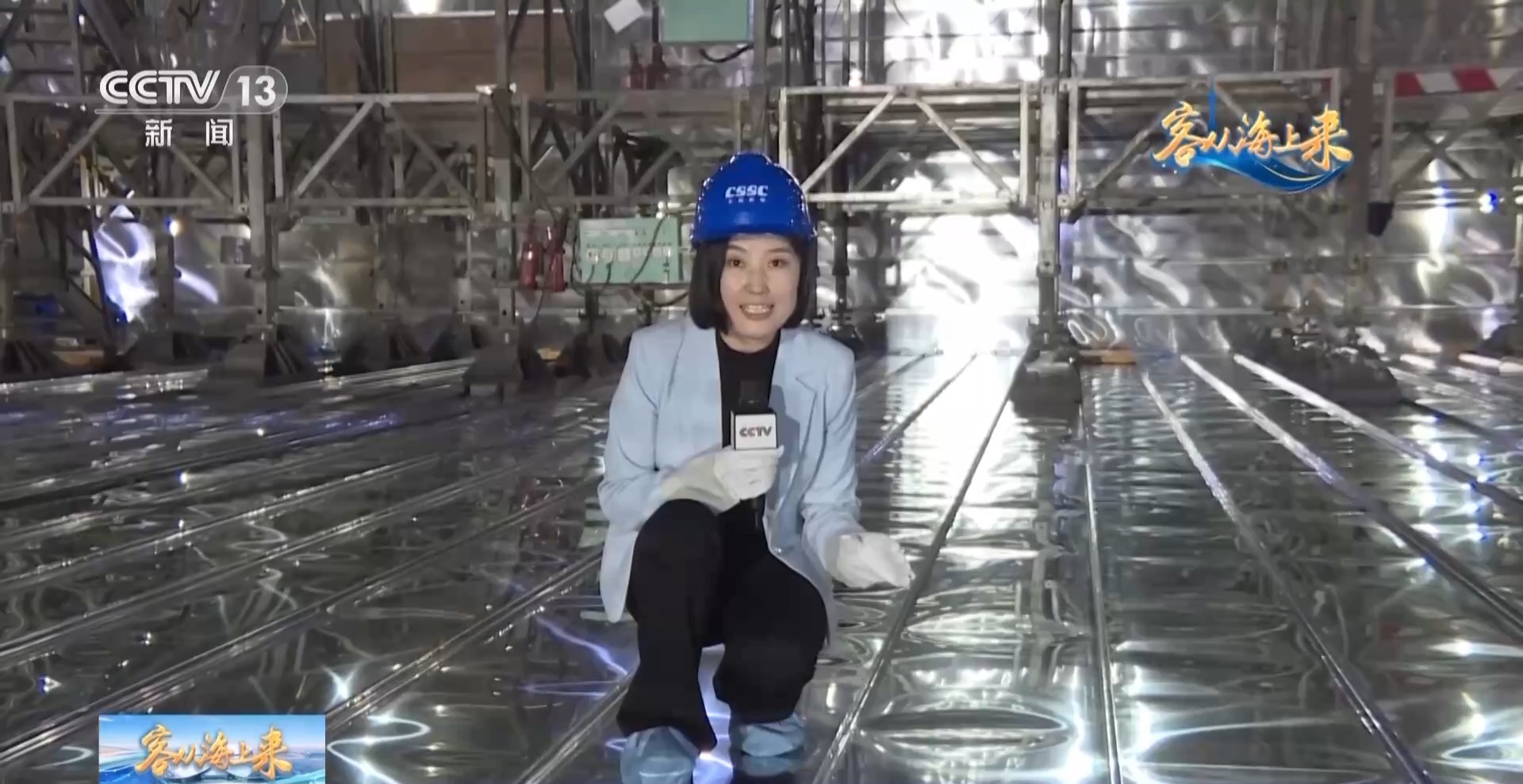 总台央视记者 李琳:我现在就来到了一艘正在建造的LNG船最核心的液货舱的部分,脚下这种银光闪闪的钢板,就是能够承受零下163摄氏度的殷瓦钢,这种薄如纸片的钢材在2017年以前是不能实现国产的。