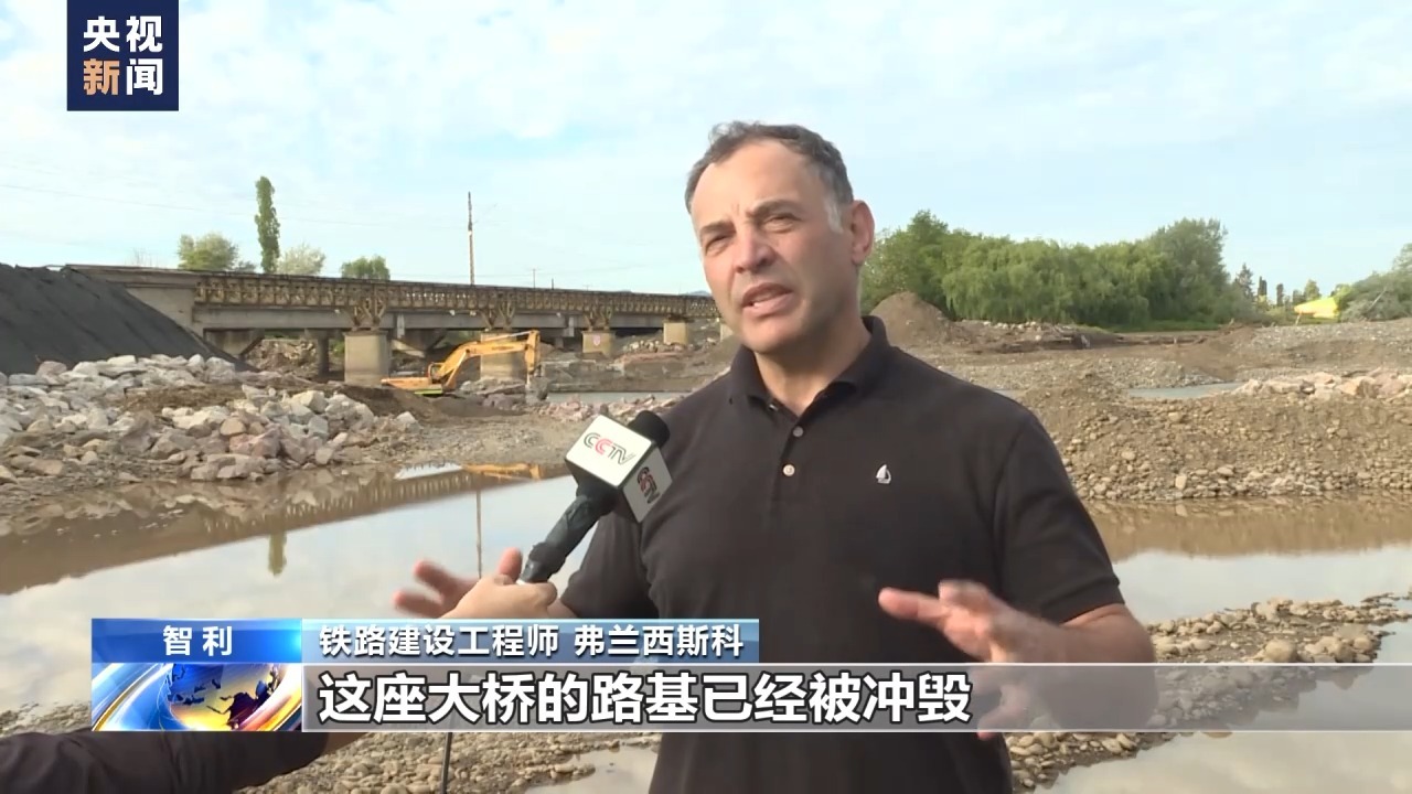 总台记者 王玉国:里尔盖河上的这座大桥位于圣地亚哥以南240公里。在今年的6月24日,一场巨大的洪水冲毁了铁路桥两侧的路基,现在四个多月过去了,现场仍在施工抢修当中。