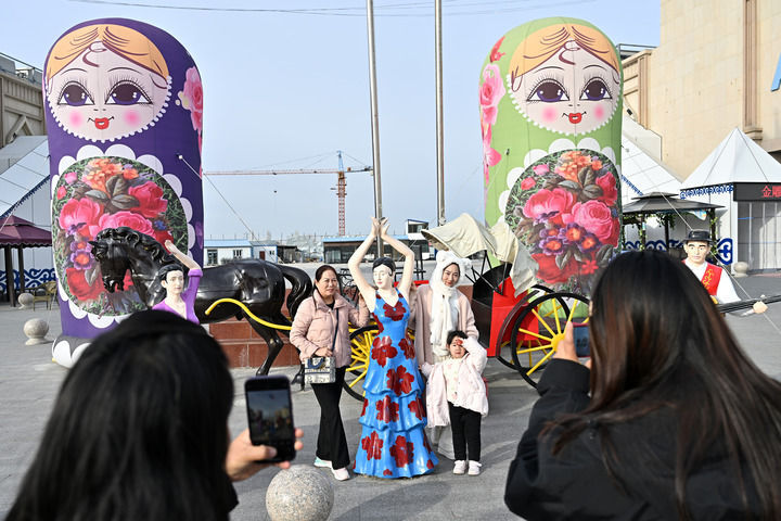 11月8日,游客在中哈霍尔果斯国际边境合作中心哈方区域打卡拍照。新华社记者 李鑫 摄