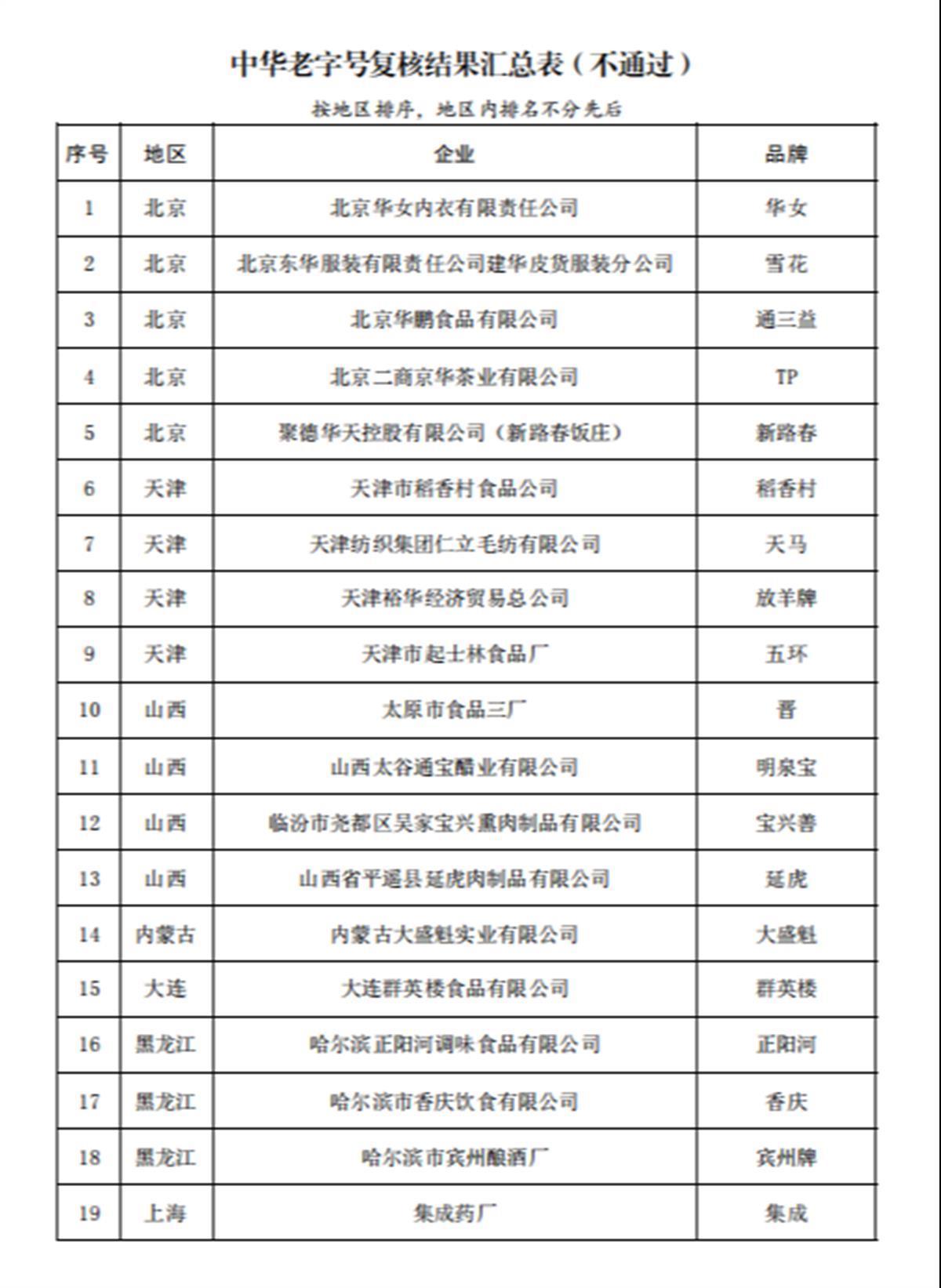 部分未通过“中华老字号”复核的品牌 (来源:商务部官网截图)