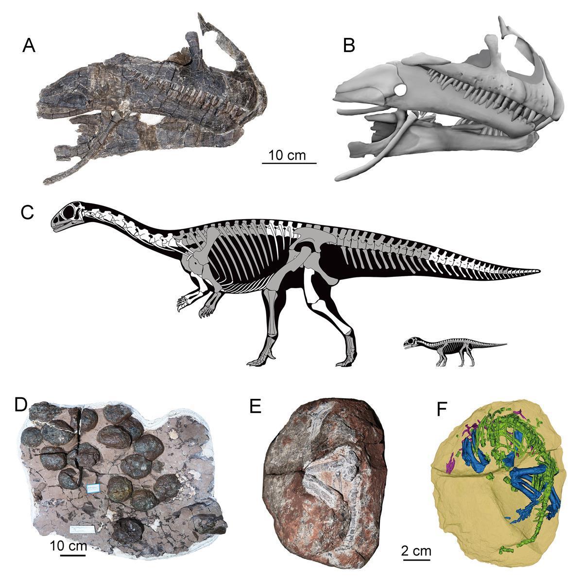 守护黔龙的头骨(A, B);成体和幼体骨骼复原图(C); 蛋窝(D);胚胎化石及3D重建图(E, F)