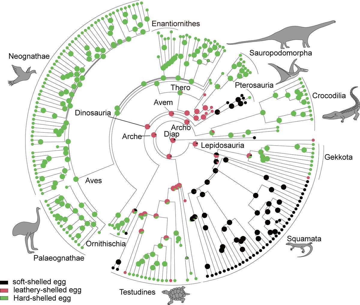 为了研究恐龙及其他爬行动物在繁殖方式上的宏演化规律,研究人员在前人的基础上收集了爬行动物210个类群,并对所有类群的蛋壳类型和蛋壳厚度等指标进行了统计,建立迄今最大的爬行动物数据库。在此基础上进行了祖先状态恢复分析,结果表明最早的恐龙蛋为革质蛋,外壳柔软似皮革,柔韧不易碎,不同于先前的软壳蛋(无或极薄钙质层)和硬壳蛋的起源。鳄类、恐龙和翼龙在演化的过程中蛋的相对大小呈现递增的趋势。而在蛋的形态变化上,最早的恐龙为亚圆形或椭圆形,兽脚类恐龙明显有延长的趋势。另外还发现大多数爬行类在演化的过程中均有蛋壳增厚的趋势。