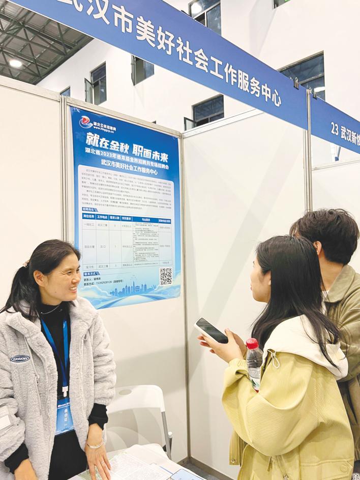 11月9日,2023年湖北省本级金秋招聘月专场招聘会上,社工机构提供的岗位受到大学生关注。 (湖北日报全媒记者 童晨曦 李光正 摄)