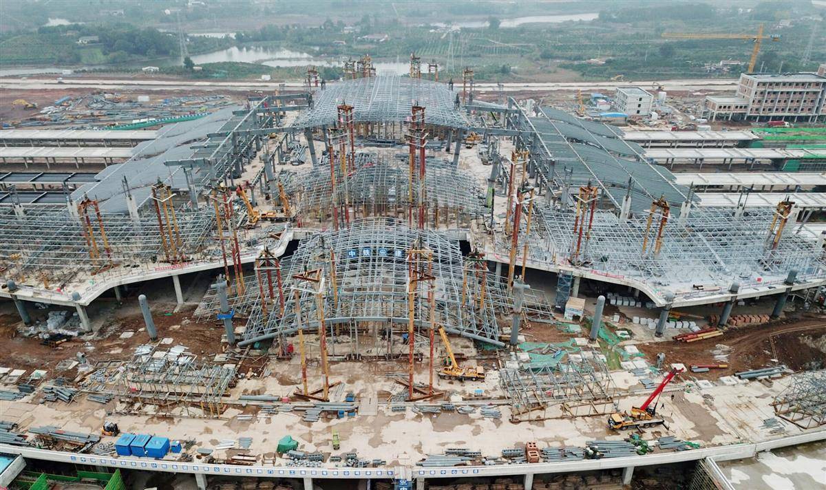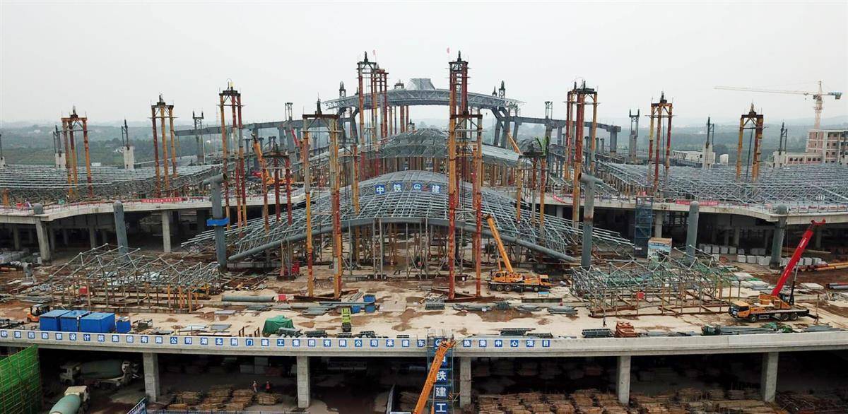 11月10日,由中铁建工集团承建的沪渝蓉高速铁路武宜段荆门西站项目钢网架首次提升成功,标志着荆门西站站房工程进入外装和内装施工阶段,为下一步作业奠定了坚实的基础。沪渝蓉高速铁路武宜段荆门西站项目位于荆门市漳河新区,是国家“八纵八横”高铁网的第五纵“呼南通道”(含襄阳至荆门段、荆门至荆州段)和第五横“沿江高铁”的结合点,站房总建筑面积4万多平方米,设计容量3000多人。该站屋盖采用空间网架形式,造型取自“凤舞荆楚,振翅高飞”,体现了高铁在新时代城市高速发展的特征,建成后将成为荆门市首个高铁站,为荆门打造未来影响全国的通航名片。(湖北日报全媒记者 张鸿 通讯员 李慧敏 朱舜 摄)