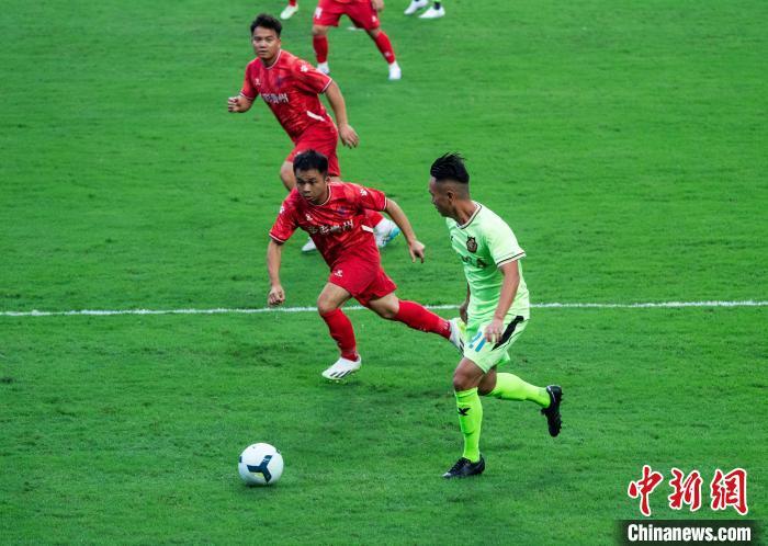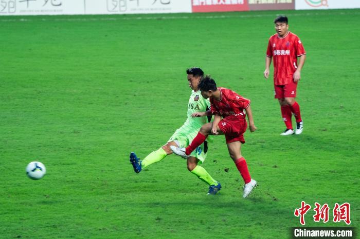 图为贵州榕江“村超”联队队员(红衣,中)在比赛中传球。 中新网记者 侯宇 摄