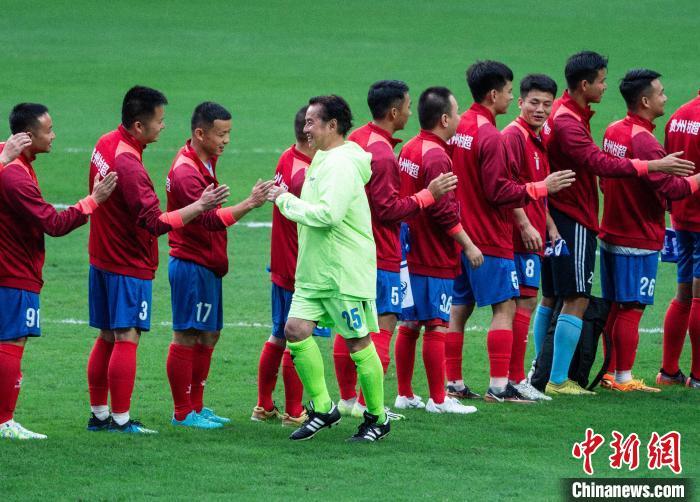 图为香港明星队队长谭咏麟开赛前与贵州榕江“村超”联队队员击掌致意。 中新网记者 侯宇 摄