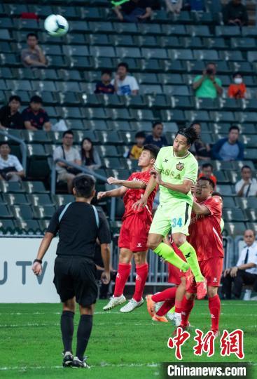 图为香港明星队队员(青衣)与贵州榕江“村超”联队队员争抢头球。 中新网记者 侯宇 摄