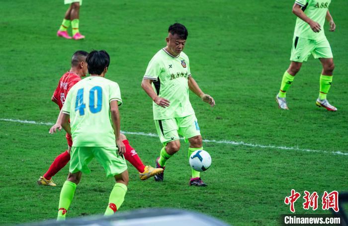 图为香港明星队队员陈百强(右)在比赛中拼抢。 中新网记者 侯宇 摄
