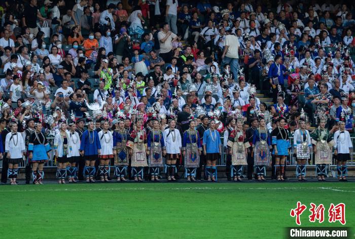 图为一名身着贵州少数民族服饰的观众观看比赛。 中新网记者 侯宇 摄