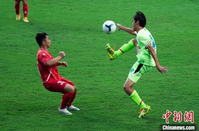 图为香港明星队队员(青衣)和贵州榕江“村超”联队队员拼抢。 中新网记者 侯宇 摄