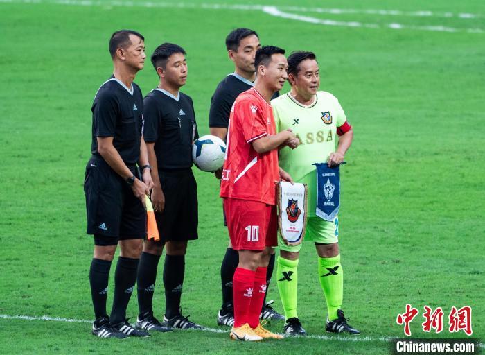 图为香港明星队队长谭咏麟(前右)和贵州榕江“村超”联队队长开赛前互换队旗并握手合影。 中新网记者 侯宇 摄