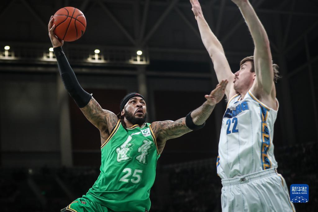 11月12日,北京北汽队球员利夫(上)在比赛中投篮。新华社记者 潘昱龙 摄