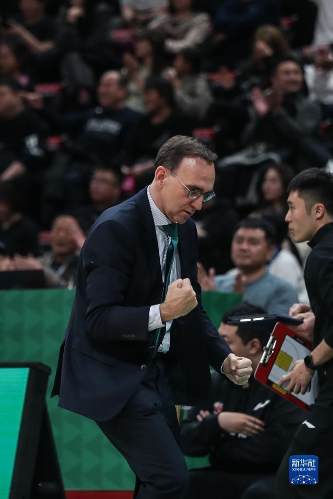 11月12日,辽宁本钢队主教练乌戈在比赛中庆祝。新华社记者 潘昱龙 摄