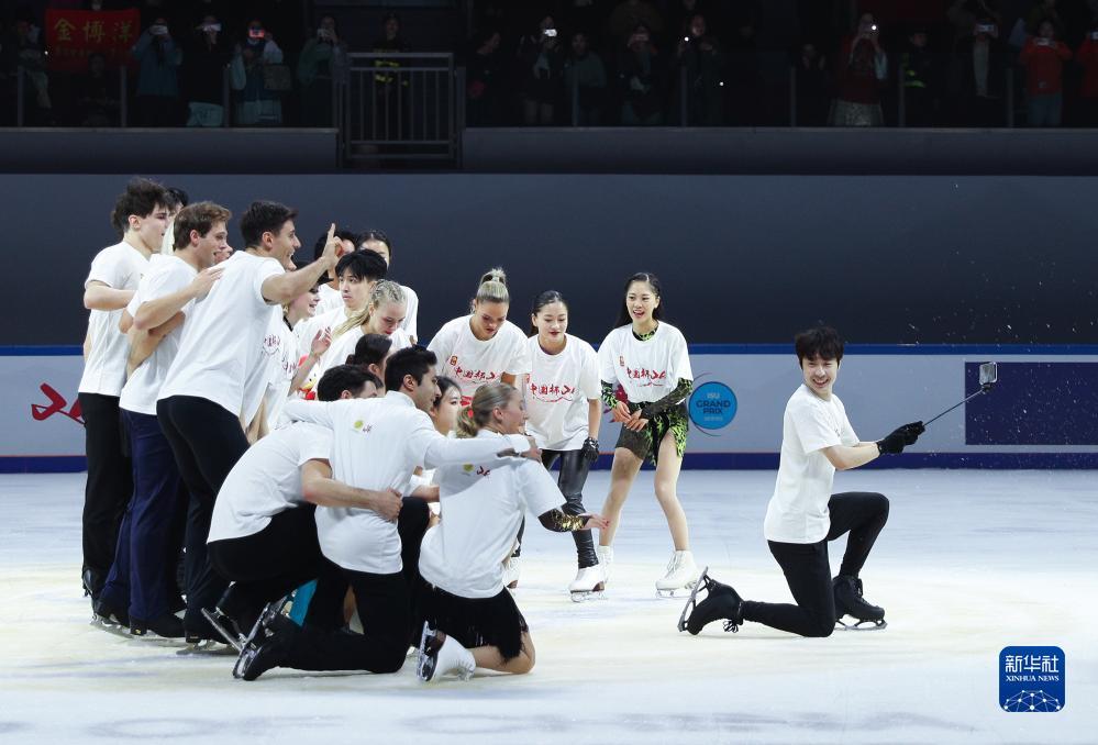 11月12日,中国选手金博洋(右一)在表演滑后与选手们自拍合影。新华社记者 许雅楠 摄