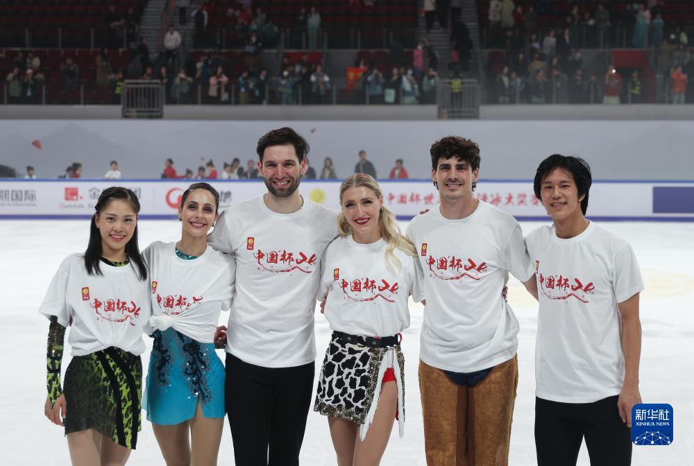 11月12日,冰舞比赛冠军加拿大组合派珀·吉勒斯(右三)/保罗·波里尔(右二) 、女子单人滑比赛冠军日本选手吉田阳菜(左一) 、男子单人滑冠军法国选手萧传文(右一)、双人滑比赛冠军加拿大组合斯特拉托(左二)/德尚在表演滑后合影。新华社记者 许雅楠 摄